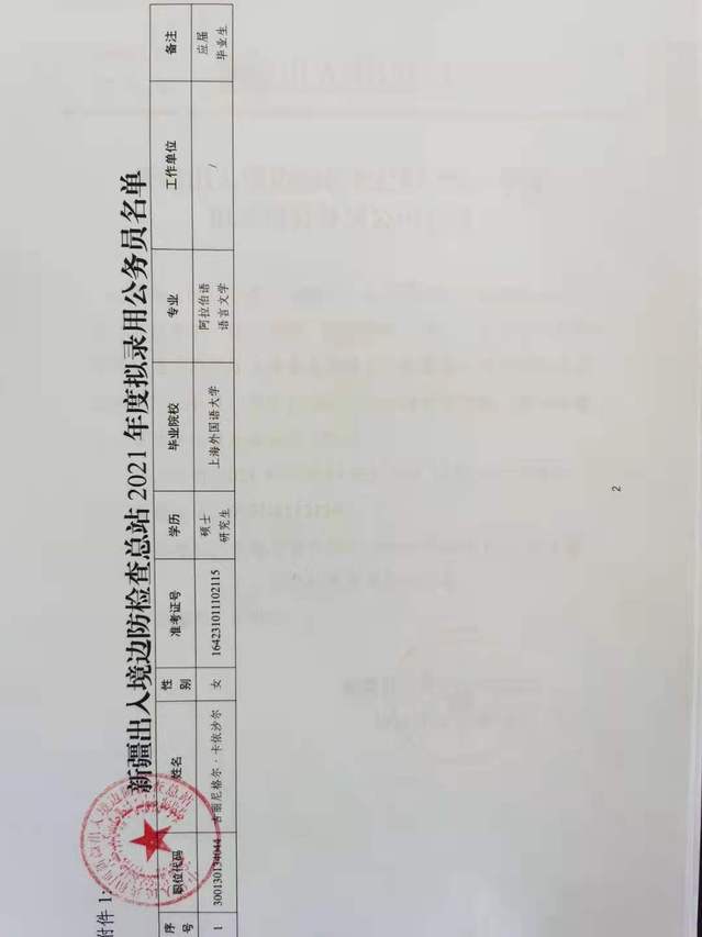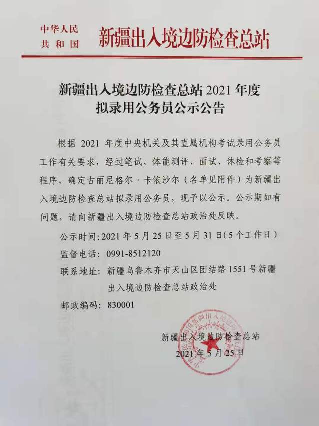 关于新疆出入境边防检查总站拟录取东方语学院硕士研究生古丽尼格尔·卡依沙尔的公示