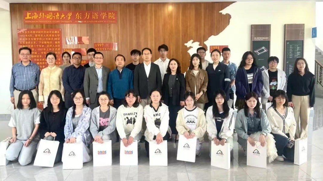 2025年4月16日,上海外国语大学东方语学院举办2025亚非研究青年研习营开营仪式。上外招生办公室主任张建,东方语学院院长程彤、党委副书记(主持工作)王征、副院长兼阿拉伯语系系主任陈越洋、朝鲜语系系主任金慧婷,教师代表赵新建、鞠舒文、李卫峰、杜怡宁和17名上海市春招录取的2025级阿拉伯语专业、朝鲜语专业学子出席开营式。活动由学院党委副书记李燕主持。